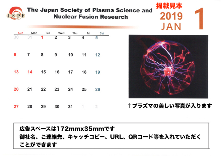 スポンサー企業様には、各月のカレンダーの「下帯」に御社名、ご連絡先、キャッチコピー、URL、QRコード等を入れていただくことができます。また、カレンダーの図案(写真等)には、学会員から募集したプラズマ・核融合研究の現場のダイナミックで美しい写真や図を使用します。