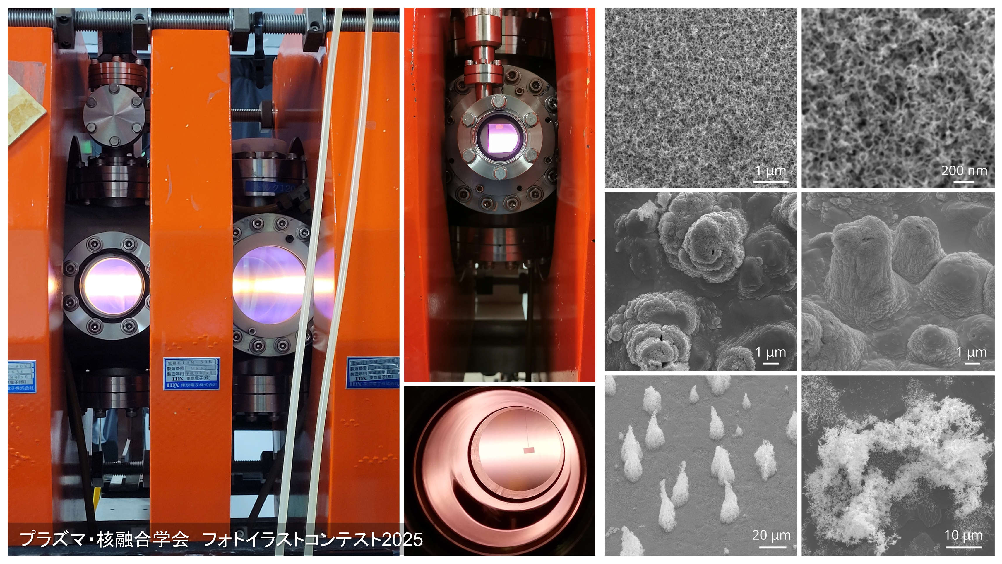ダイバータ模擬用の直線型プラズマ装置「NAGDIS-II」でネオンやアルゴンを混合したヘリウムプラズマを生成して、タングステン基板に照射すると、さまざまな形状のナノ構造体を形成することができます。