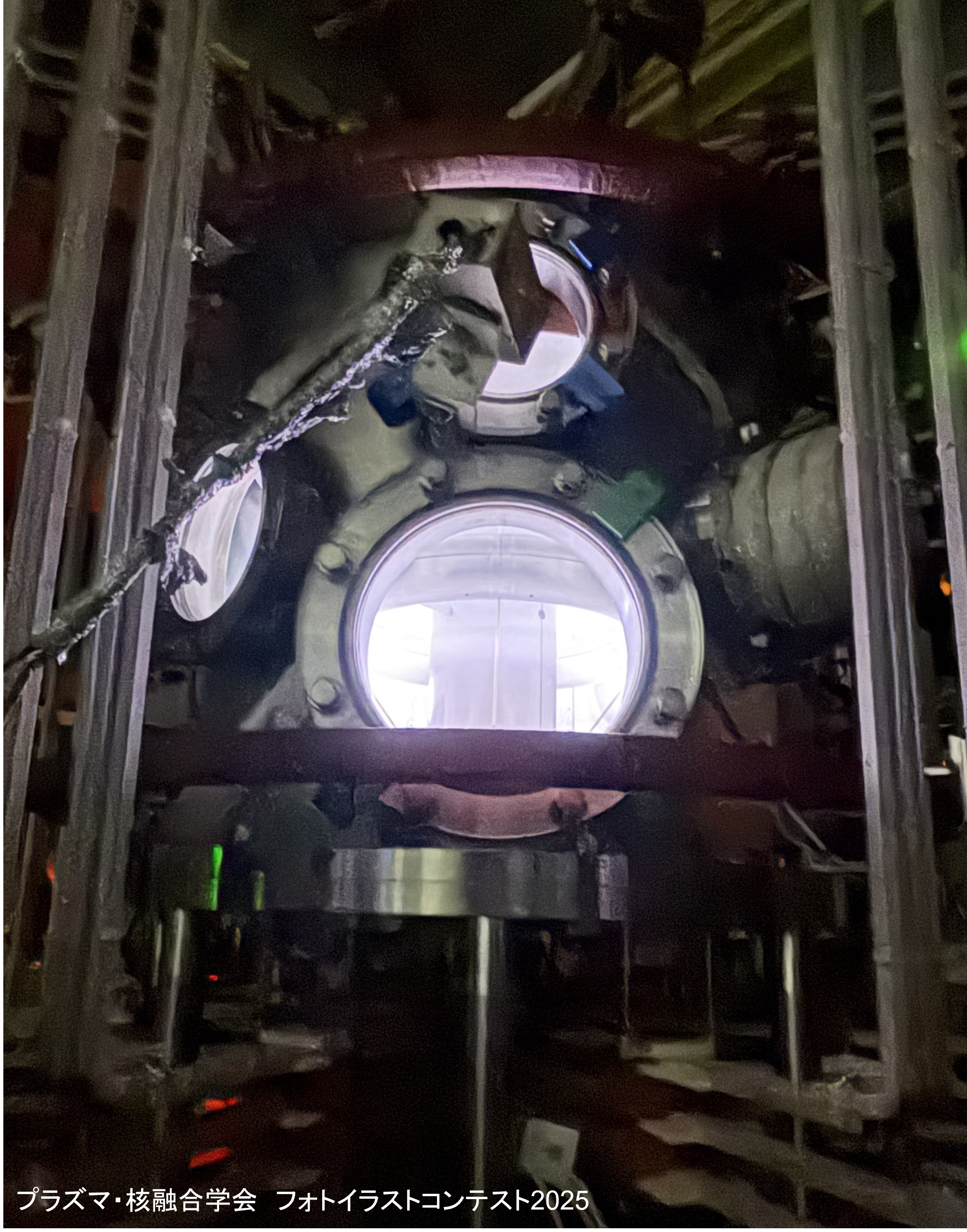 筑波大学プラズマ研究センターでは、核融合原型炉開発に向けた定常高密度プラズマ生成を目指して建設を進めてきた新たな超伝導ミラー型装置 Pilot GAMMA PDX-SC において、2022年10月にファーストプラズマの生成に成功しました。写真は、カスケードアーク放電によって生成された定常高密度水素プラズマが差動排気チャンバーを抜け、超伝導コイルスロート部へ流入していく様子を撮影したものです。スロート部を通過したプラズマに対し、単純ミラー配位によるプラズマの閉じ込め領域を利用した加熱によりプラズマ温度の上昇をはかり、原型炉ダイバータ模擬に向けた先導的研究を展開します。